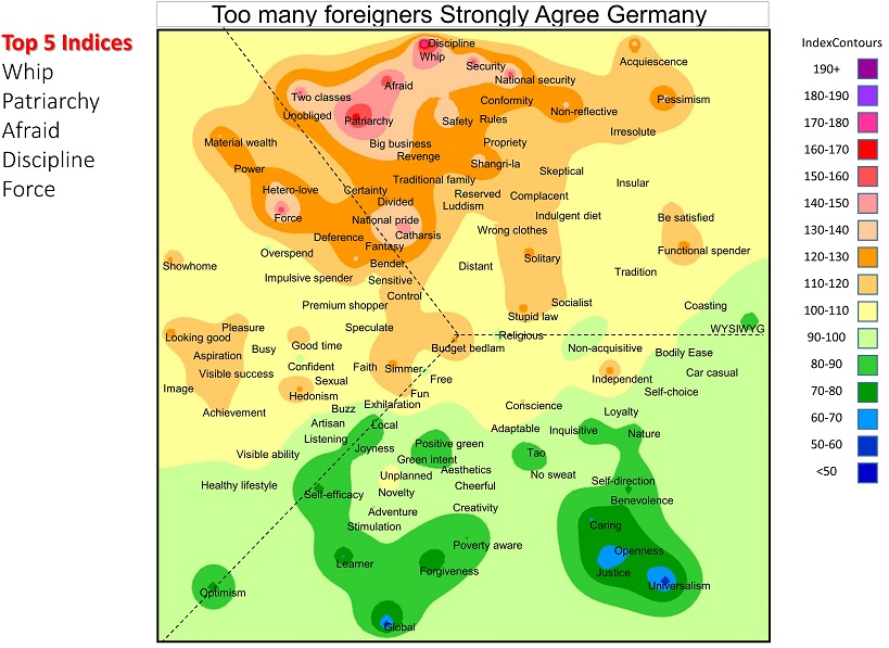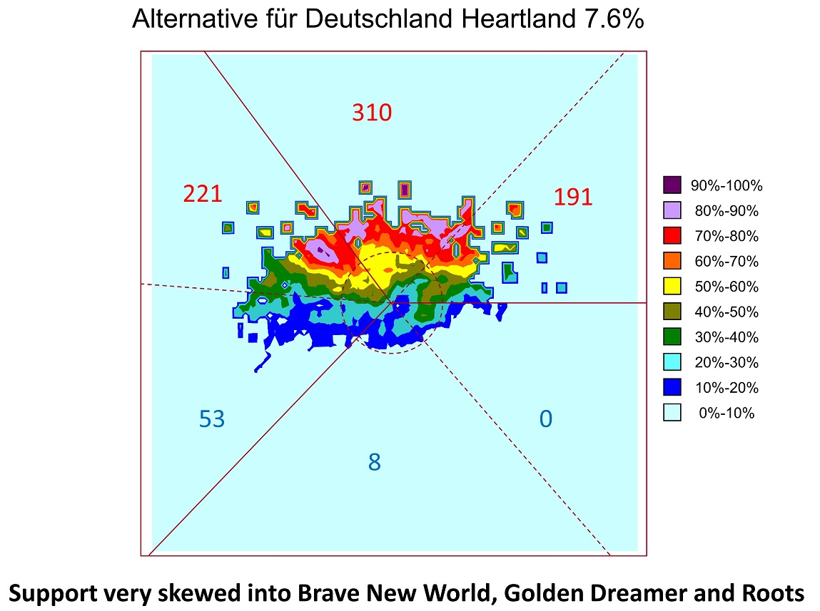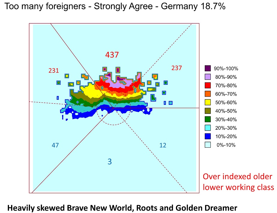 This is shown in the following two maps that quite clearly show the overlapping nature of the values of their supporters – the Heartland – and those who strongly agree that there are too many foreigners in their country, a group of people more than twice the size of AfD heartland espousers.