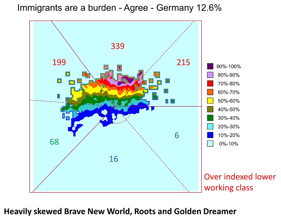 AfD has probably picked up many of these espousers in the recent election, even if it was not their first choice when voting. This extension of the AfD vote, likely based on the perception of immigrants as a burden, presents a challenge to more mainstream parties who will tend to reflect the Pioneer and Now People values – which do not agree with this orientation.