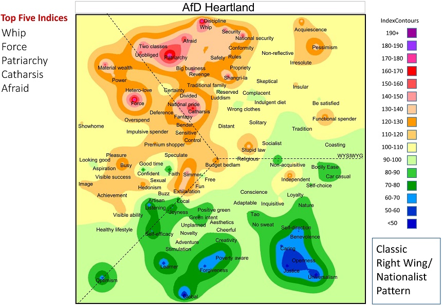 The AfD Heartland analysis at this level reveals the detail missing from the classic Terrain Maps. In relation to the German population these respondents are more likely to espouse the Attributes that fall on the cusp of the area of the map that equates to a transition zone from Settler to Prospector.