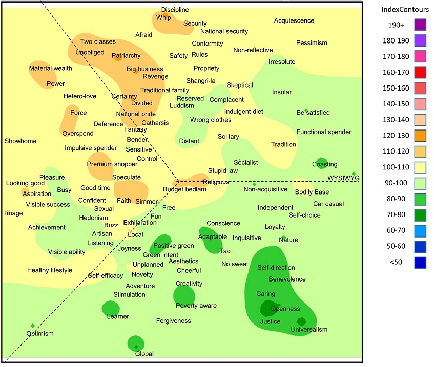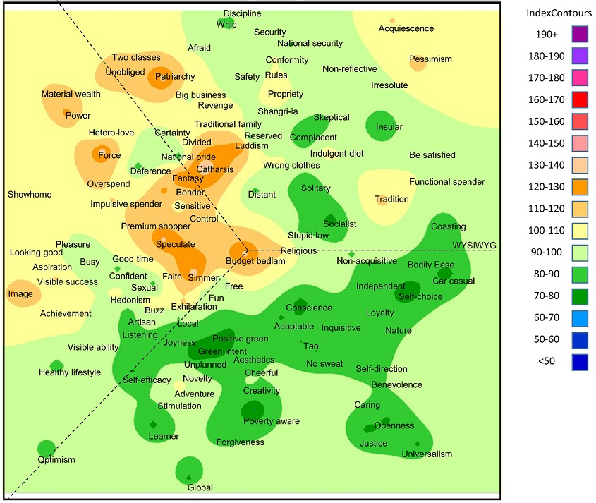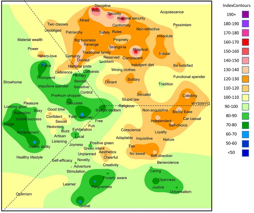 Even more significant is the emphasis in the middle of the map where many people exhibit less systemic values driven behaviours, changing them in a manner that can cause bedlam in lifestyles.