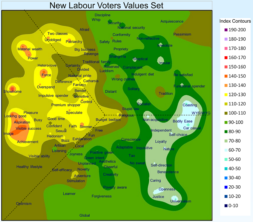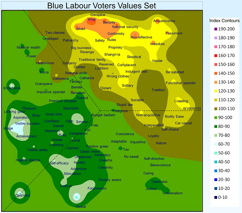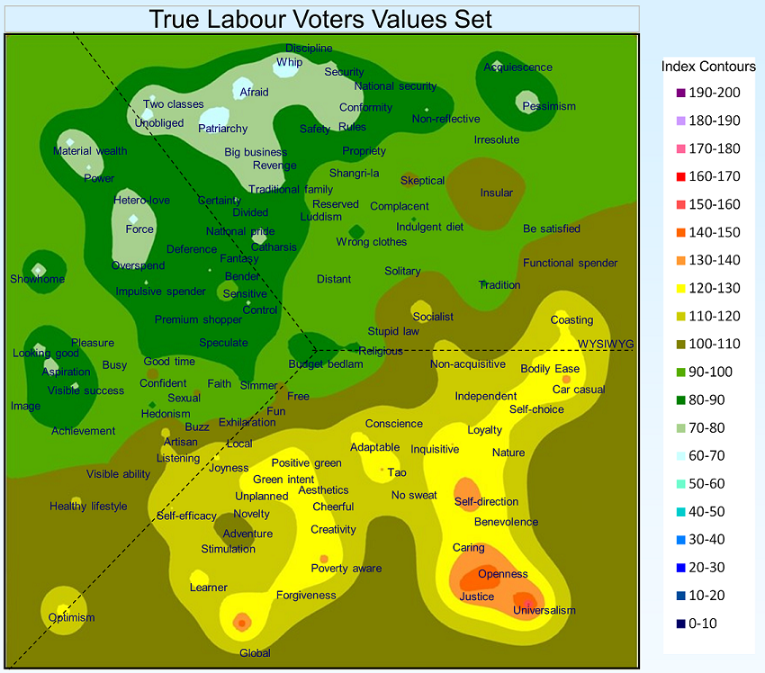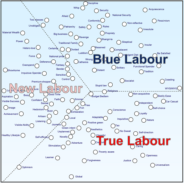 The coalition of values that produced Labour’s halcyon years in power are typified as Prospector Values. This values set includes 38% of the population and was the basis for Tony Blair’s appeal to the electorate in multiple elections. Appealing to aspects of their values systems – such as Aspiration, Show-home, Material Wealth, Visible Success, Image, Looking Good, Buzz - created the good time feel of voting for a government that matched its values. The darker side of this appeal is that this values set included other aspects – such as Force, Control, Simmer, and a sense of self entitlement that includes Unobliged, Two Classes and Patriarchy - that are polar opposites to the values system of True Labour. New Labour values essentially usurped many of the aspects of the Prospector values set that the Conservative Party had promulgated as their own.