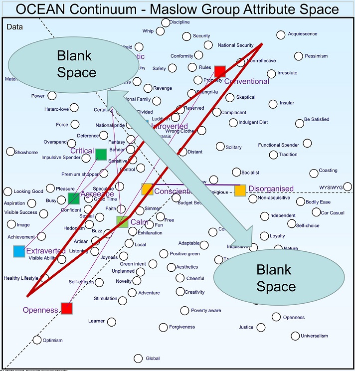 Les Higgins’ graphic representation of his OCEAN analysis had revealed what appeared to be to be at least two big ‘blank spaces’ on the CDSM values space map – possibly another axis of information that was not being measured by OCEAN. We had to ask ourselves:-