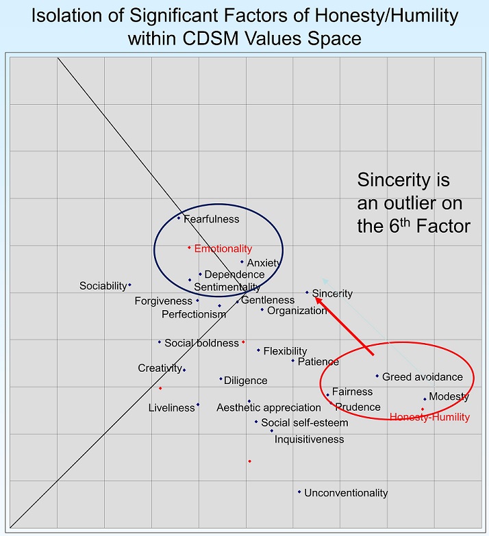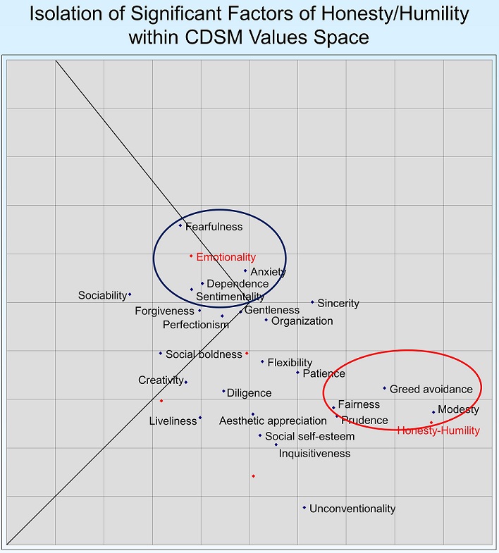 What the results suggested was that Honesty/Humility may indeed be a separate factor that was congruent with factors within CDSM values space on an entirely different axis than the OCEAN factors – and even possibly a paired opposite relationship with Emotionality.