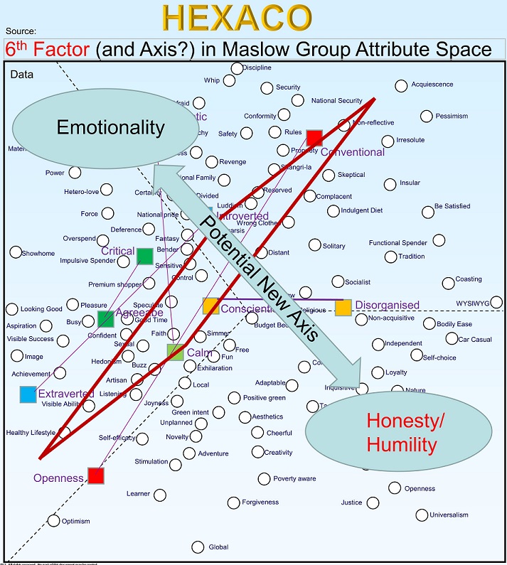 The CDSM insight into HEXACO was that the scale-derived data identified two quite different factors tagged with the titles Honesty/Humility and Emotionality that appeared to fill in the areas that were ‘Blank Spaces” on the CDSM values map when OCEAN was tested. The analysis strengthened the suppositions a) that there was a second axis in a personality model based on a hybrid OCEAN/HEXACO model and b) that the hybrid model would contribute to deeper insights into the CDSM values model – and vice versa.